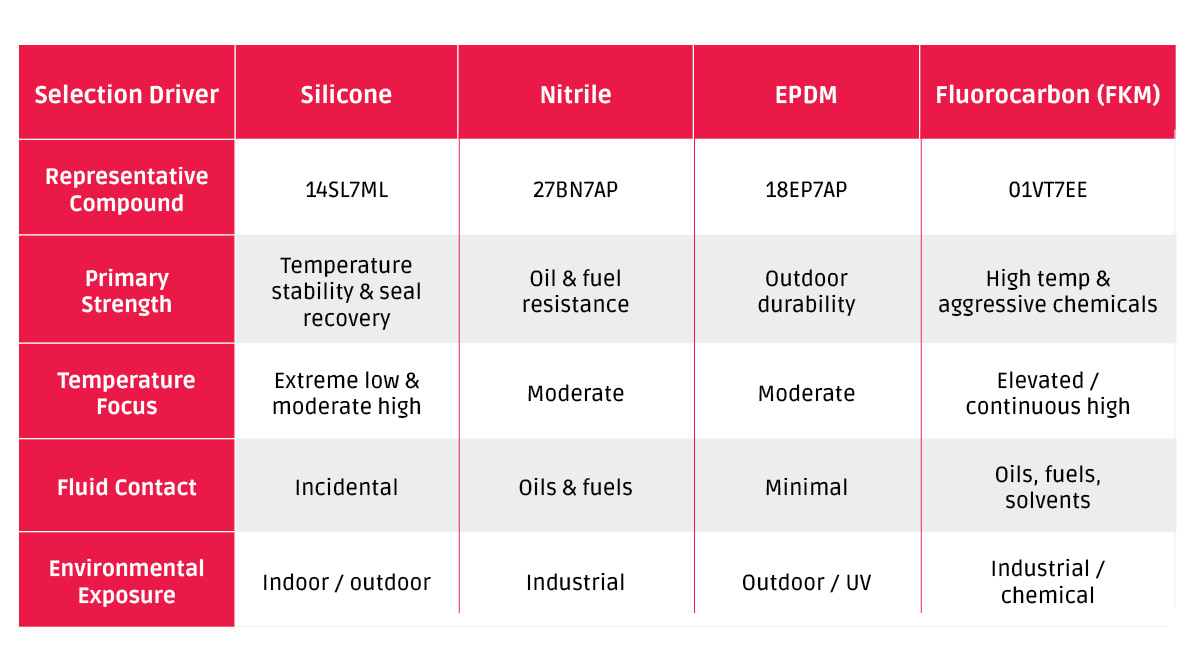 No single elastomer performs optimally across all environments. Temperature extremes, fluid exposure, outdoor aging, and mechanical stress each drive different material requirements. To address this reality, our UL-recognized compound portfolio spans multiple elastomer chemistries, allowing material selection to be aligned with actual service conditions rather than over- or under-specifying a single solution.