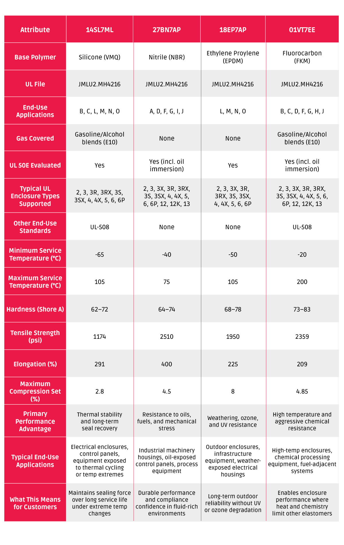 *Note: It is important to understand UL recognition supports material selection by providing documented performance benchmarks and formulation control. While UL does not certify elastomers for all possible applications, it establishes a reliable framework for evaluating consistency, durability, and suitability within regulated systems.