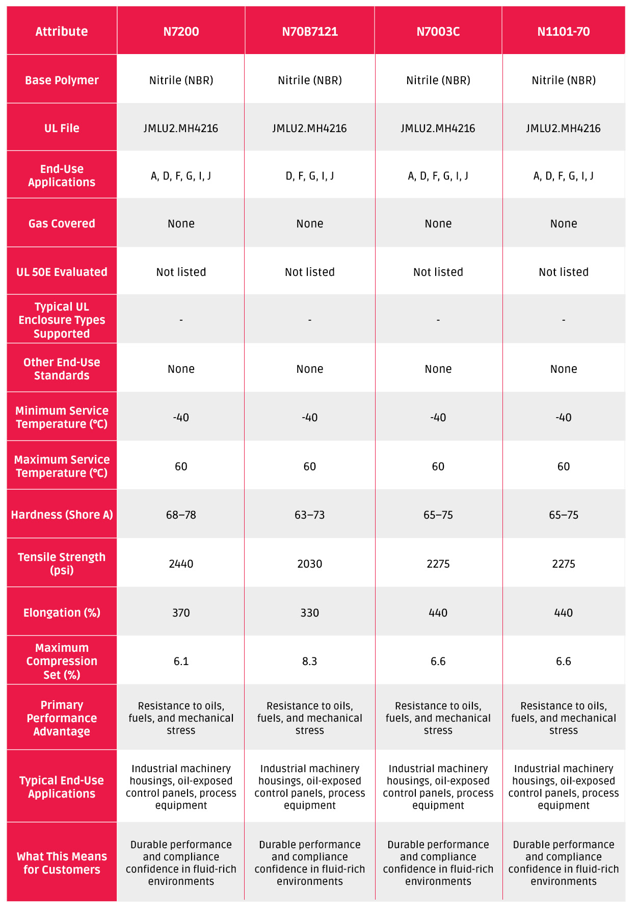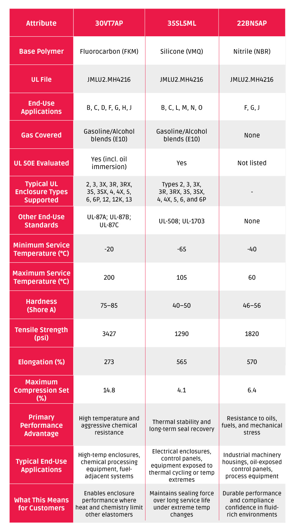 This portfolio approach allows customers to select elastomer materials based on real-world operating conditions, while maintaining the assurance that each option has been evaluated within the UL framework. The result is improved confidence during product approvals, reduced certification risk, and greater long-term reliability in the field.