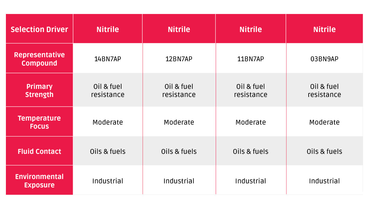 • Nitrile compounds are selected where oils, fuels, and industrial fluids are present. Their balance of mechanical strength and chemical resistance supports durability in machinery and process-driven applications.